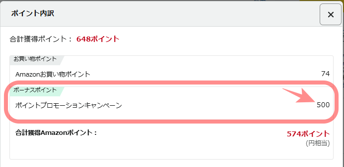 【A群】500A 【B群】500B💡ポイント付与は、レジの明細(PCなら右側)の内訳クリックから、「ポイントプロモーションキャンペーン」に500があることで確認できます。