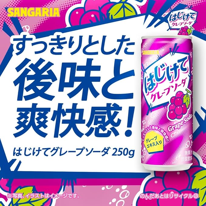 純水にグレープエキスを加えた甘く爽快な炭酸飲料。後味がすっきりしており、炭酸の刺激が程よく効いて飲みやすいのが特徴。果糖ぶどう糖液糖使用、合成甘味料ではなく香料・着色料で風味づけ。のどごしを楽しみたい時や、食事との組み合わせにぴったりです。