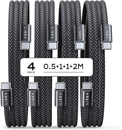 LISENのUSB-C to USB-C ケーブル4本セットは、60W出力対応の急速充電仕様。ケーブル長は 0.5m・1m・1m・2m のバリエーションであり、家族や複数デバイスを一括でカバー可能。48本のナイロン織り構造で耐久性を強化し、折れ・断線に強い設計。PD規格対応でiPhone 17/16/15 Pro Max や Galaxy S25/24、iPad、Switch など多機種に対応。