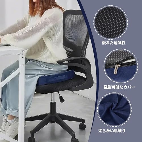 U字形状で体圧を真ん中から周りに分散し、お尻の圧力をよく吸収し、長時間座りによる負担を軽減する効果があります。尾骨部分への圧迫を軽減し、産後・腰痛・痔・正座・オフィス・車いす用など幅広い用途に対応。表地はメッシュ仕様で通気性が高くムレにくく、カバーは着脱式で洗濯も可能。