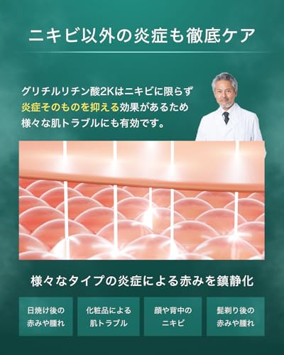 日焼け後の肌やニキビが気になる部分をやさしくケアする医薬部外品タイプのクリームです。抗炎症成分や肌の鎮静成分を配合し、炎症を抑えながら肌を落ち着かせます。ユーカリミントの香りで清涼感があり、べたつきにくく、男女を問わず使いやすい処方設計です。朝晩のスキンケアルーチンに組み込みやすく、日焼け後のお手入れや吹き出物予防に適しています。