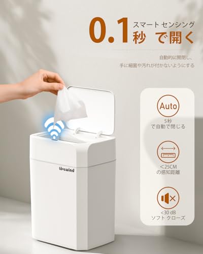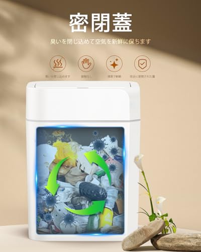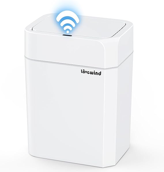 Lovewindの自動ゴミ箱は、手をかざすだけでフタが開くタッチレス設計。12リットルの容量で、バスルームや寝室、キッチン、オフィスなど幅広く使えます。密閉性が高く、臭い漏れを防止。コンパクトながら静音モーターを採用し、清潔で快適な空間を保ちます。単三電池式で設置も簡単。