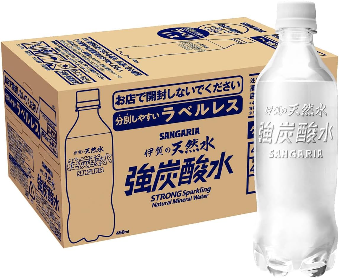 三重県伊賀の天然水を使用し、クセのないクリアな味わいと爽快な炭酸の刺激を両立。ガスボリューム5.0(充填時)という強めの炭酸設定で、ストレートでもお酒の割材としても活躍します。ラベルレス仕様でゴミもコンパクトに。450ml×24本のケース販売仕様で、日常使いにもまとめ買いにも便利な一本です。