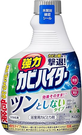 強力カビハイターシリーズの香りおさえ仕様で、塩素臭が気になりにくい処方が特徴です。壁・浴室のタイル・ゴムパッキンなど、カビが発生しやすい場所に使いやすい噴射型。密着成分配合により“きめ細かい泡”が垂直面にもとどまり、カビの根にもしっかりアプローチします。グリーンフローラルの香り付きで、使用時の不快感を軽減。