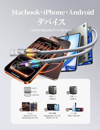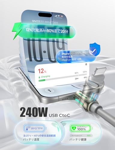 Lightning・USB-C両対応の最大240W急速充電モデル。液体シリコーン素材で柔軟かつ絡みにくく、C to C/A to C/Lightning各種デバイスに対応。2mロング設計で家庭用・車内・出張先でも使いやすい高耐久タイプです。