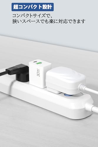 PD30W出力対応のType-C×USB-A2ポート急速充電器。次世代素材GaN(窒化ガリウム)採用で発熱を抑え、小型でも高出力を実現。PSE適合済みで安全性にも配慮し、iPhone・iPad・Android・MacBookなど幅広い機器に対応します。出張や持ち歩きにも便利なコンパクト設計。