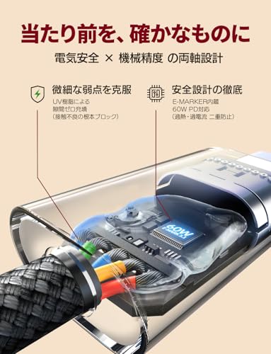 LISENのこの4本セットUSB-C to USB-C ケーブルは、最大60W対応のPD規格に準拠。家族のスマホ・タブレット・ゲーム機など複数デバイスを1セットでまかなえる仕様で、48本のナイロン編みケーブルを採用し高耐久性を確保。短めから長め(0.5m + 1m + 1m + 2m)まで用途に応じた長さが揃い、安心して毎日使える一本です。