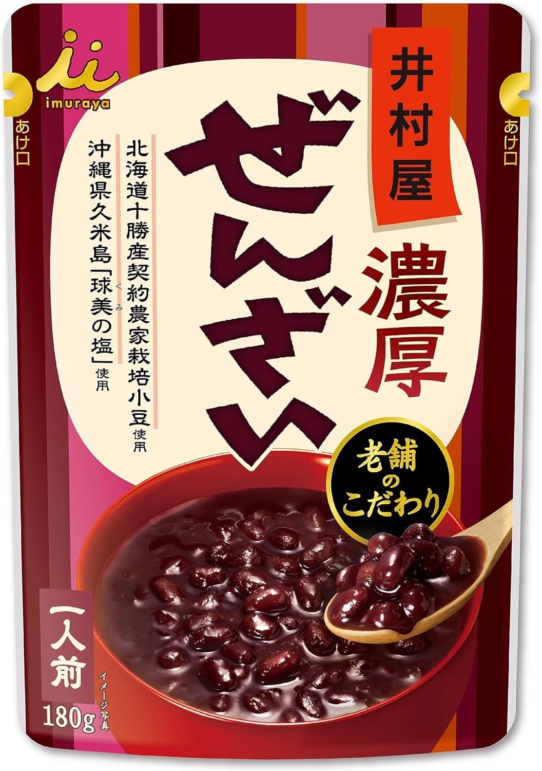 井村屋「濃厚ぜんざい」は、北海道十勝産契約農家栽培小豆を使用し、沖縄県久米島の塩「球美の塩」や黒糖をブレンドして、あずきの風味豊かでコク深い味わいに仕上げられています。180gの食べきりサイズが5袋セットで、温めるだけで手軽に本格ぜんざいを楽しめます。