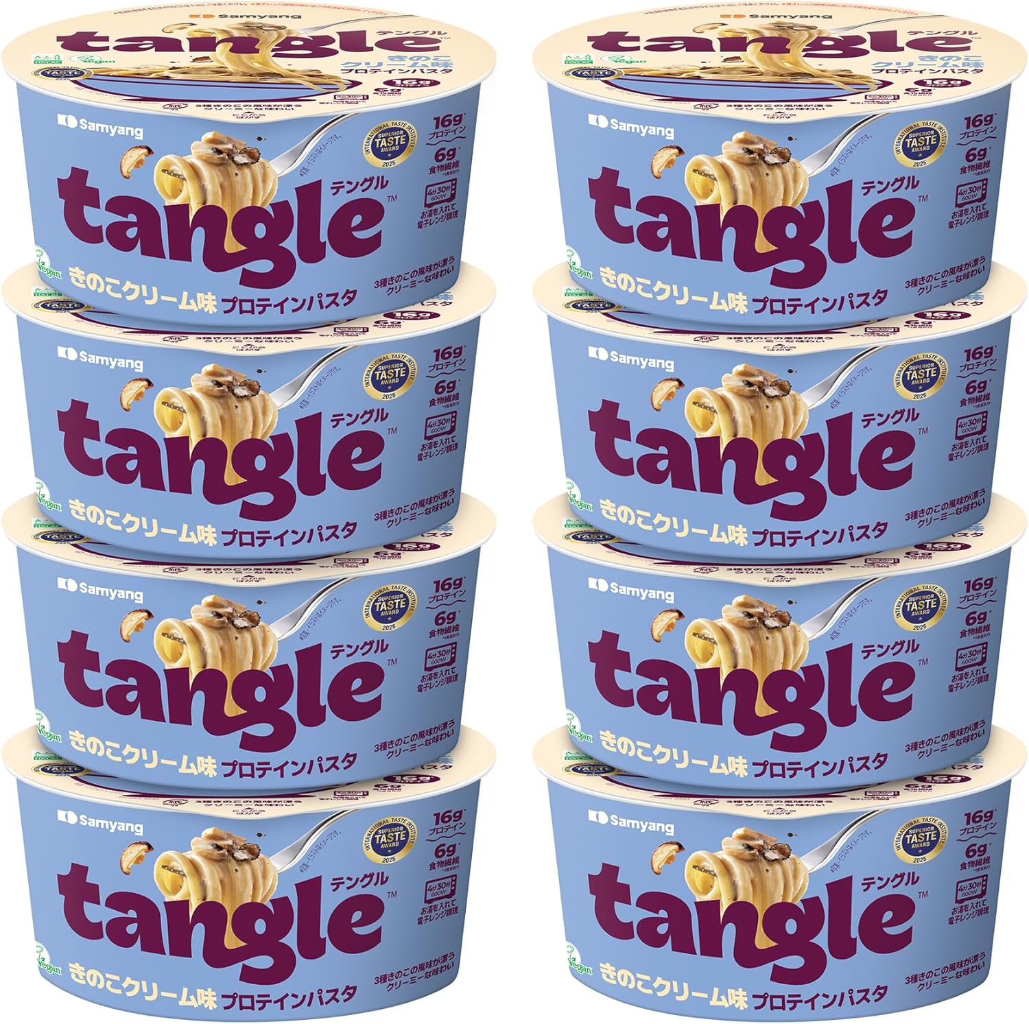韓国発パスタブランド「テングル(tangle)」から登場した「きのこクリーム味」は、トリュフ・椎茸・マッシュルームの3種のきのこを使った贅沢クリームソースを、ひよこ豆等を原料とした高たんぱく&高食物繊維のノンフライ麺に絡めた一杯。健康志向にも応える370kcal前後/16g以上たんぱく質という数値設計で、手軽にプロ級の味を楽しめるインスタントパスタです。