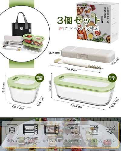 -35%【2,132円】[PR] 耐熱ガラス 保存容器 3点セット(240ml×2、560ml×1) – 電子レンジ・オーブン・冷凍対応 シリコン蓋 密閉容器 弁当箱セット(弁当袋+食器+清潔ブラシ付き) 離乳食 作り置き 液漏れ防止