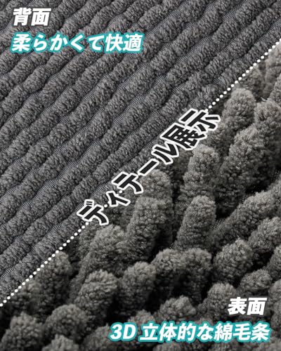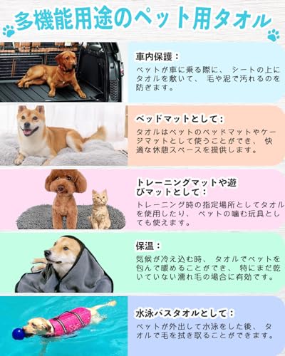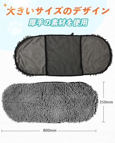 サイズ:80cm x 35cm。雪尼ール繊維(シェニール織り)を採用した超吸水仕様で、濡れた被毛を素早く乾かすペット専用タオル。3D立体綿毛条デザインにより吸水面積が広く、両端のポケットでペットが逃げにくく扱いやすい構造です。洗濯後も型崩れしにくい柔らか素材で繰り返し使えます。