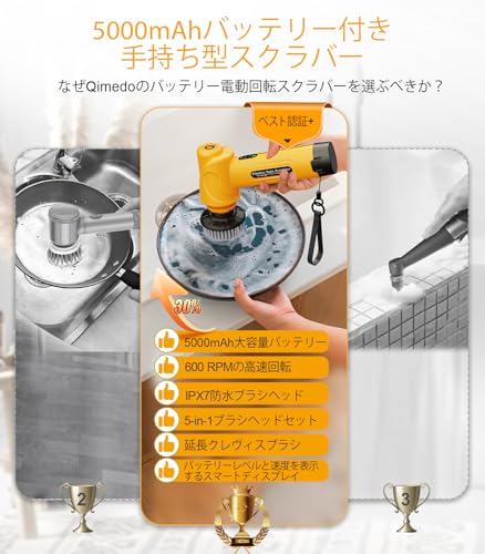 -50%【3,600円】[PR] Qimedo 電動お掃除ブラシ 手持ち式 コードレス回転スクラバー 5種類ブラシヘッド付き