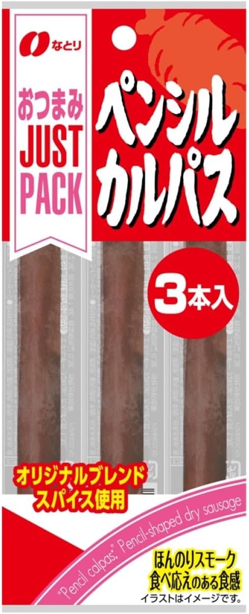 なとりの「ペンシルカルパス」は、1袋に7g×3本入り、計21gのドライソーセージスナック。スモーク風味を効かせた食べ応えある食感で、10袋入りでまとめ買いが可能。鶏肉(国産)や豚脂肪、香辛料を使用し、おやつやおつまみとしても人気です。