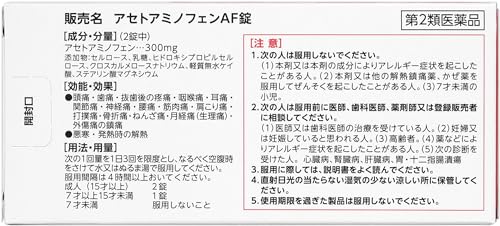 【医薬品・解熱鎮痛薬】「アセトアミノフェンAF錠」は、解熱鎮痛成分アセトアミノフェンを主成分とした錠剤タイプの医薬品で、熱・痛みを速やかに抑えます。7才以上の子どもから成人まで使用可能。眠くなる成分を含まないため、日中の使用にも対応しています。