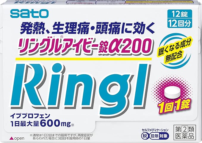 佐藤製薬の「リングルアイビー錠α200」は、痛み・熱・炎症を抑える指定第2類医薬品。頭痛・生理痛・関節痛・筋肉痛などに効き目があり、1錠にイブプロフェンを200mg配合したタイプの錠剤12錠入りです。