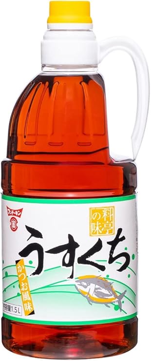 かつお節と昆布だしを加えた旨味深い薄口醤油。素材の色味や風味を大切にした和食・煮物・吸い物などに適しており、1.5Lの大容量サイズで家庭用常備からまとめ買いまで幅広く対応します。