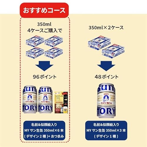 “グッとくる飲みごたえと、かつてない飲みやすさ”を両立させた新定番。天然水100%仕込みで、麦のうまみと爽快な後味を両立。アルコール度数5%、350ml缶×24本(or 48本)入り。キャンペーン対象の「絶対もらえるMYサン生缶」仕様で、購入特典も付いたお得なケース販売モデルです。