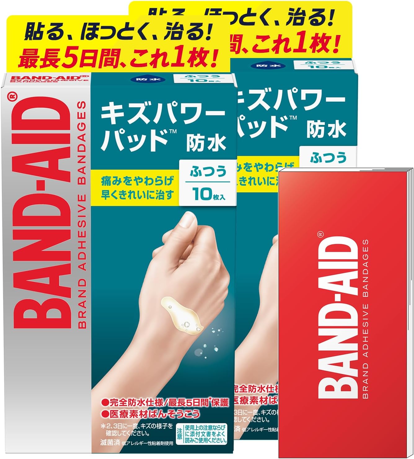 BAND-AID「キズパワーパッド」は、ハイドロコロイド素材が傷口の湿潤環境を保ち、痛みをやわらげながら自然治癒をサポートする高機能パッド。ふつうサイズ10枚入り×2個に加え、Amazon限定のおまけ付き。防水仕様で剥がれにくく、指・関節まわりにも使いやすく、日常の軽いケガ対策に便利です。
