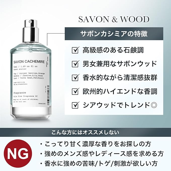 清潔感のある石鹸のような「サボンウッド」香調をベースにしたユニセックス向けオードトワレ。柔らかく優しい香りで、男女問わず使いやすく、普段使いからデート、通勤・通学まで幅広く対応。50 mLサイズで持ち歩きやすく、自分用にもギフトにもおすすめの香水です。