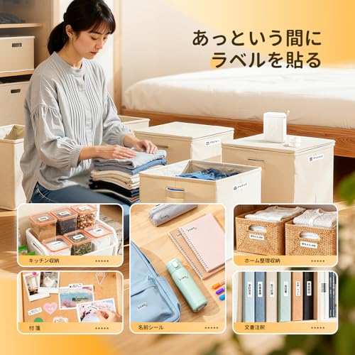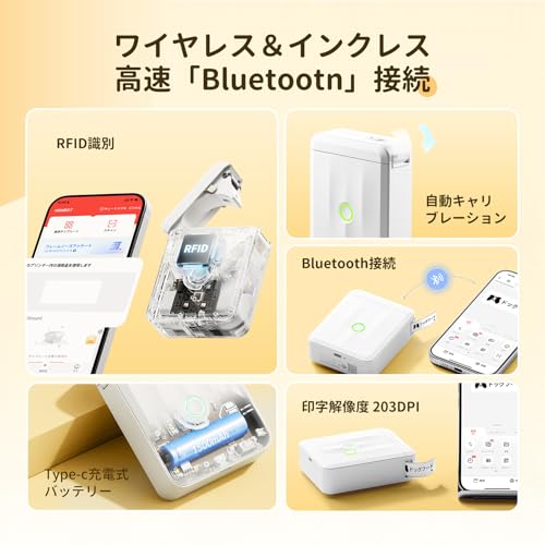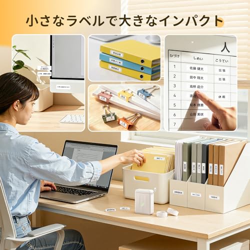 スマホとBluetoothで接続するポータブルなラベルプリンターで、幅12-15mmのラベルテープに対応し、値札、名前シール、書類ラベル、調味料ラベルなど多用途に使えます。インクやリボン不要の熱転写式で、補充の手間が少ない点が魅力。約1200mAh(あるいは新版では1500mAhとの情報も)バッテリー搭載で、4〜5時間の連続使用が可能。App には多くのフォント・枠デザイン・アイコンがあり、ラベル挿入後の自動ラベル幅認識機能で用紙の無駄を減らせます。Type-C 充電と日本語取扱説明書付きで、家庭やオフィスでの整理整頓に便利な一台です。