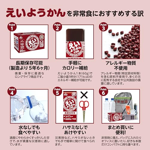 「井村屋 えいようかん」は、1本60gの羊羹が20本入った大容量パック。小分け包装で 長期保存が可能 なため、日常のおやつとしてはもちろん、非常食や備蓄用にも最適です。甘さ控えめでほどよい食感ながら、エネルギー補給にも適しており、登山・運動前後のカロリー補給にも便利。保存食としてストックしておけば、急な災害時やアウトドアシーンでも活躍する定番アイテムです。