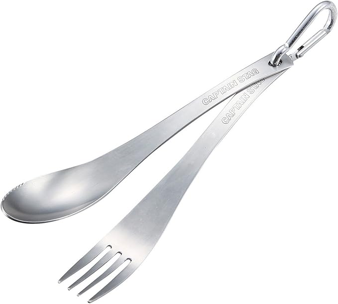 キャプテンスタッグのライン ステンレスカトラリーセットは、スプーン(ギザギザでちょっとした食材などをカットすることが可能)・フォーク・カラビナの3点セット。丈夫なステンレス製で、キャンプやバーベキュー、ピクニックなど屋外シーンに対応します。コンパクトにまとめやすく、持ち運びやすいのも特徴。日本製。金物の町、燕三条で生産しています。