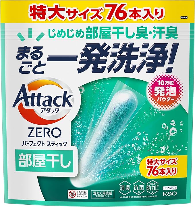 アタックZERO パーフェクトスティックは、計量いらずで使えるスティックタイプの洗濯洗剤。1本ずつ投入できるため手間を減らし、忙しい洗濯シーンでも扱いやすい設計です。液だれしにくく保管もしやすい形状で、日常の衣類洗いに便利。Amazon.co.jp限定の76本入りは、まとめ買いでストックしておきたい家庭にも向いた内容です。