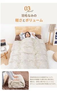 羽毛のような暖かさを持ちながらも人工羽毛(ダクロン)を使用した軽量でボリューム感ある一枚。立体キルト設計で中綿が偏りにくく、ズレ防止ループ付きで使い勝手も考慮されています。まるごと洗えるためいつでも清潔に保て、ホテルライクな寝心地を追求した暖かさは冬の寒さ対策にぴったりの仕様。軽くて暖かい布団を求める方に向いた一品です。
