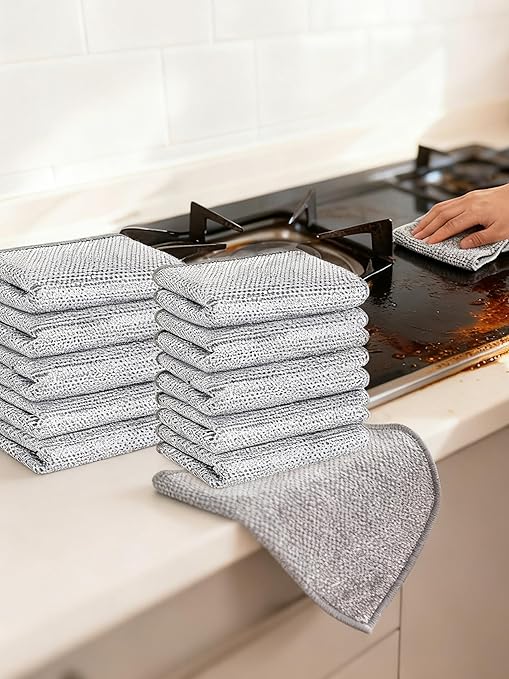 鍋・フライパン・クックトップなどの調理器具や多様な表面の汚れをしっかり落とす、傷つけにくいワイヤーディッシュクロスの10枚セット。再利用可能なスチールウールスクラバーパッドを採用し、ガラスなどの繊細な面にも安心。ウェット・ドライ両用でキッチンのお手入れに便利です。
