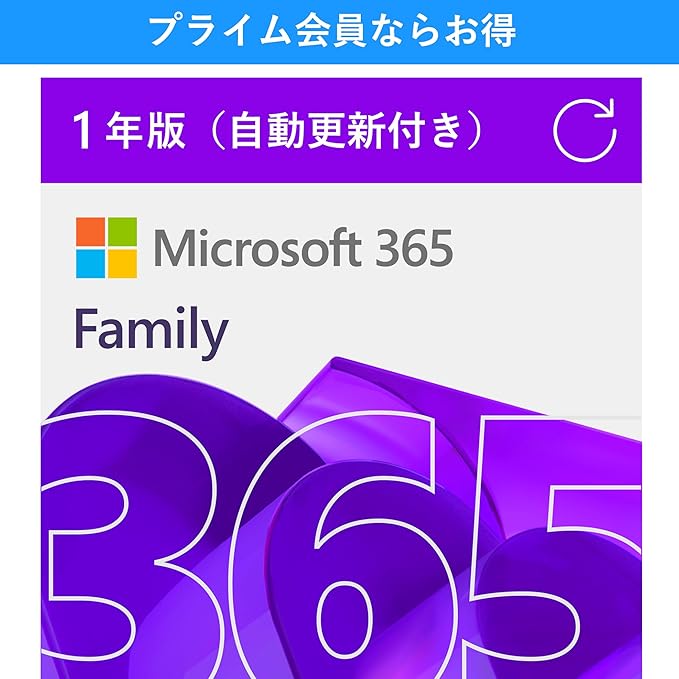 Word・Excel・PowerPointなど定番OfficeアプリにAI機能を搭載した「Microsoft 365」を、利用スタイルに合わせて4タイプまとめて掲載。個人向けのPersonalは1か月版・1年版から選択可能、家族で共有できるFamilyも同様に1か月版・1年版を用意。常に最新機能を使えるサブスクリプション形式で、文書作成や資料作り、日常業務から学習用途まで幅広く対応します。