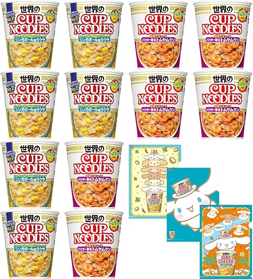 人気の「カップヌードル」ラクサトムヤムクン味をそれぞれ6個ずつ、合計12個に加え、サンリオ「シナモロール」オリジナルデザインクリアファイル3種をセットにしたコンプリートパック。インスタント麺の美味しさとキャラクターグッズの楽しさを同時に楽しめる商品で、日常使いからギフトにも最適です。