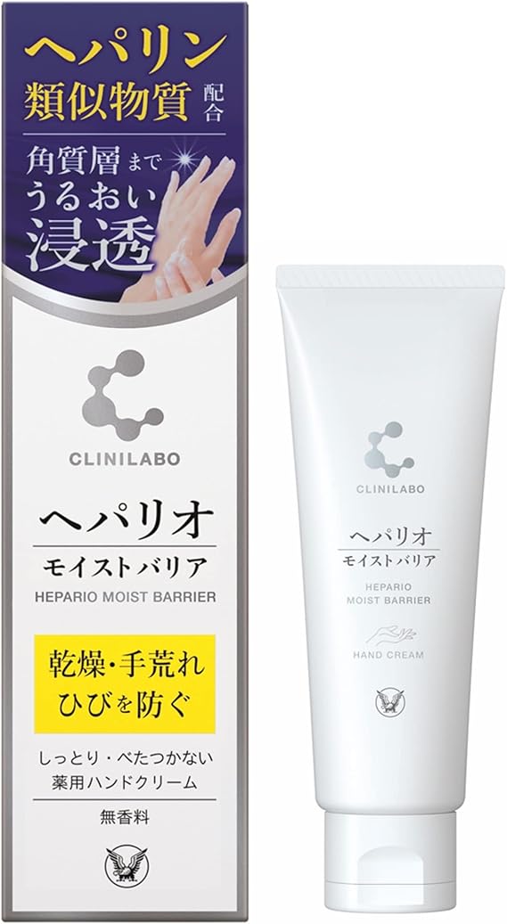 大正製薬の「クリニラボ ヘパリオ モイストバリア」は、ヘパリン類似物質やグリチルリチン酸、スクワラン、ヒアルロン酸を配合した薬用ハンドクリームです。手荒れや乾燥肌、しもやけ・ひび・あかぎれなどの肌トラブルをやさしくケアし、しっとり感が長続き。べたつきにくい使い心地で毎日のハンドケアに最適です。鉱物油・石油系界面活性剤などを配合していない処方で、日常使いにも安心感があります。
