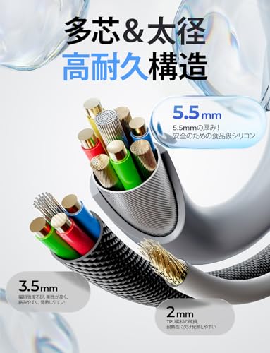 最大240WのPD急速充電に対応したType-C to Cケーブル。太めの内部構造と柔軟性のあるシリコン素材を採用し、断線しにくく長寿命設計を意識しています。2mのロングケーブルで自宅やデスク、ベッド周りでも取り回しが良好。iPhone 15以降、MacBook Pro/Air、iPad、Galaxyシリーズ、Switch 2など幅広いUSB-C機器に対応し、充電からデータ通信まで日常使いしやすい一本です。