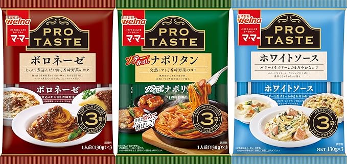人気の「マ・マー PRO TASTE」シリーズから、家庭でお店のような味を楽しめるパスタソース3種セット。挽き肉と香味野菜をじっくり煮込んだコク深いボロネーゼ、香ばしく仕上げるナポリタン、バターと生クリームで濃厚なホワイトソースなどバラエティ豊かな味わいを揃えています。それぞれ個別パックで使い切りやすく、パスタはもちろんドリアやアレンジ料理にも使える便利さが魅力。日々の食卓のレパートリーを手軽に広げるセットです。