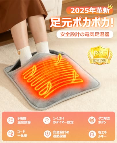 アップグレード版の電気足温器(フットウォーマー)は、9段階温度調整+1〜12時間タイマー設定で快適な暖かさが自由に選べる足元ヒーター。高級水晶ボア素材を使用し、軽量で足全体を優しく包み込む設計です。過熱保護や漏電防止機能、抗菌・防臭仕様で安心・清潔に使え、コード一体型で手軽に設置可能。さらにダニ除去ボタン搭載で季節の寒さ対策や在宅勤務の足元ケアにぴったり。PSE認証・日本語取扱説明書付きでギフトにも適した1台です。