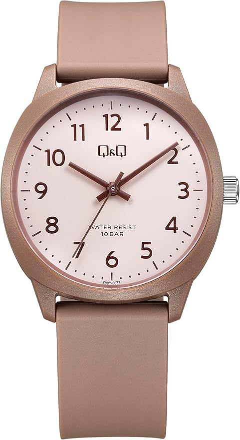 シチズンQ&Qのシンプルで使いやすいアナログウォッチ。10気圧防水仕様で日常生活はもちろん、手洗いや雨などの水濡れを気にせず使えます。軽量設計で長時間の装着も快適、見やすい文字盤とブラウンカラーの落ち着いたデザインで、普段使いからビジネスシーンまで幅広く活躍します。シンプル好きな方におすすめのベーシックモデルです。