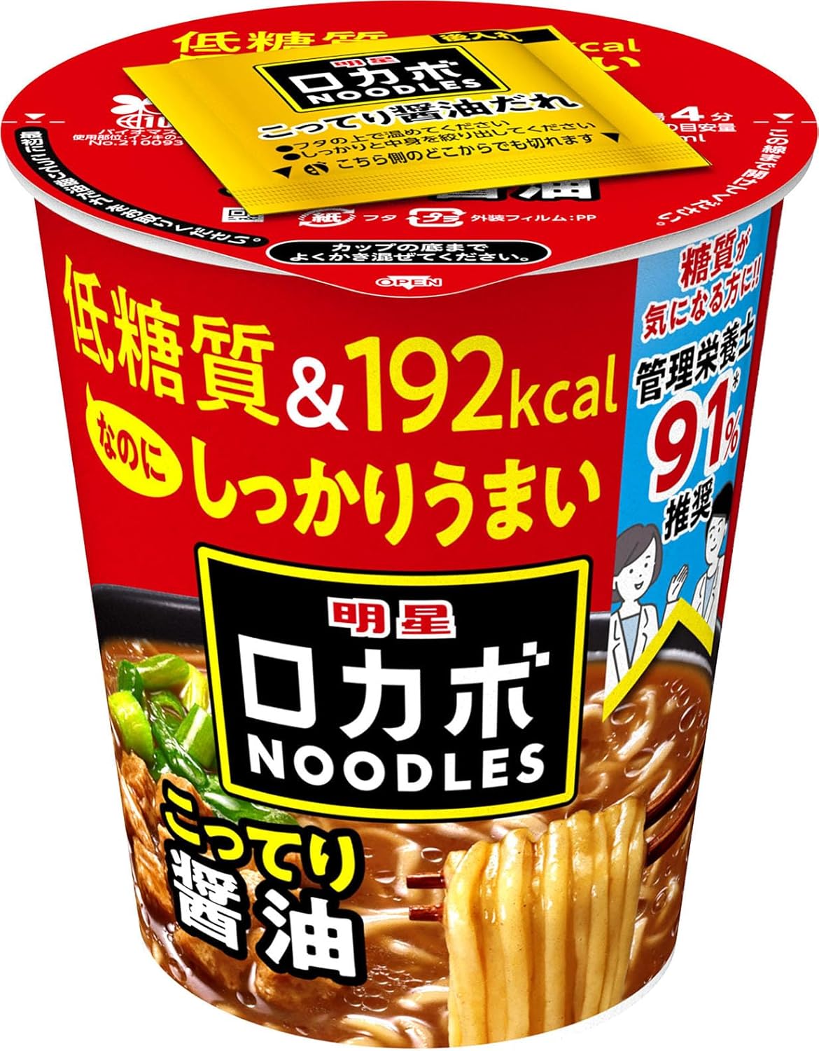 「明星 ロカボNOODLES こってり醤油」は、192kcal・糖質30%オフながらしっかりとした味わいが楽しめる低糖質カップ麺。たっぷり食物繊維入りで、糖質を気にする方にもおすすめです。こってり醤油のスープが食欲をそそり、手軽に美味しい一杯を楽しめるセット商品です。