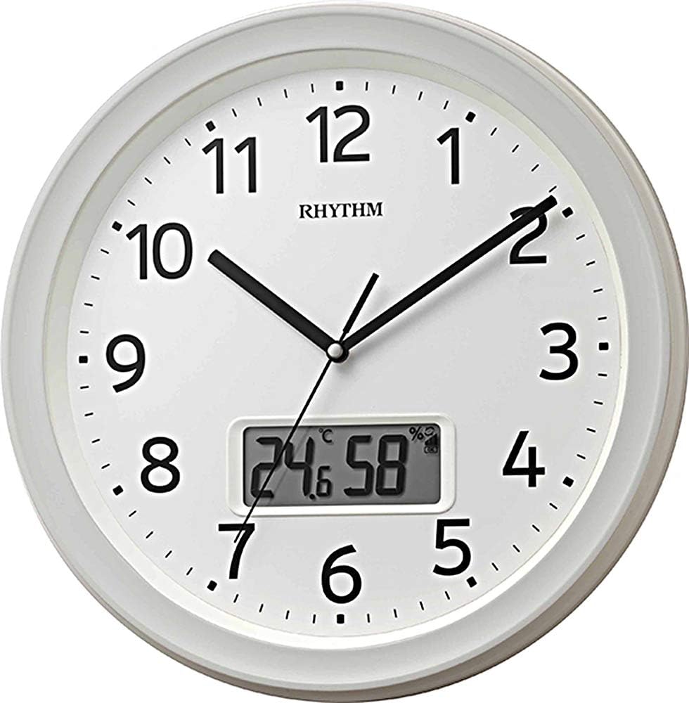 電波受信により自動で時刻を修正する掛け時計。アナログ表示に加えデジタル表示で日付や温度・湿度も確認できる多機能モデルです。連続秒針仕様でカチカチ音が気になりにくく、寝室やリビングにも設置しやすいのが特長。直径約32.5cmの見やすいサイズ感で、シンプルなホワイトデザインはどんな空間にもなじみやすい実用的な時計です。