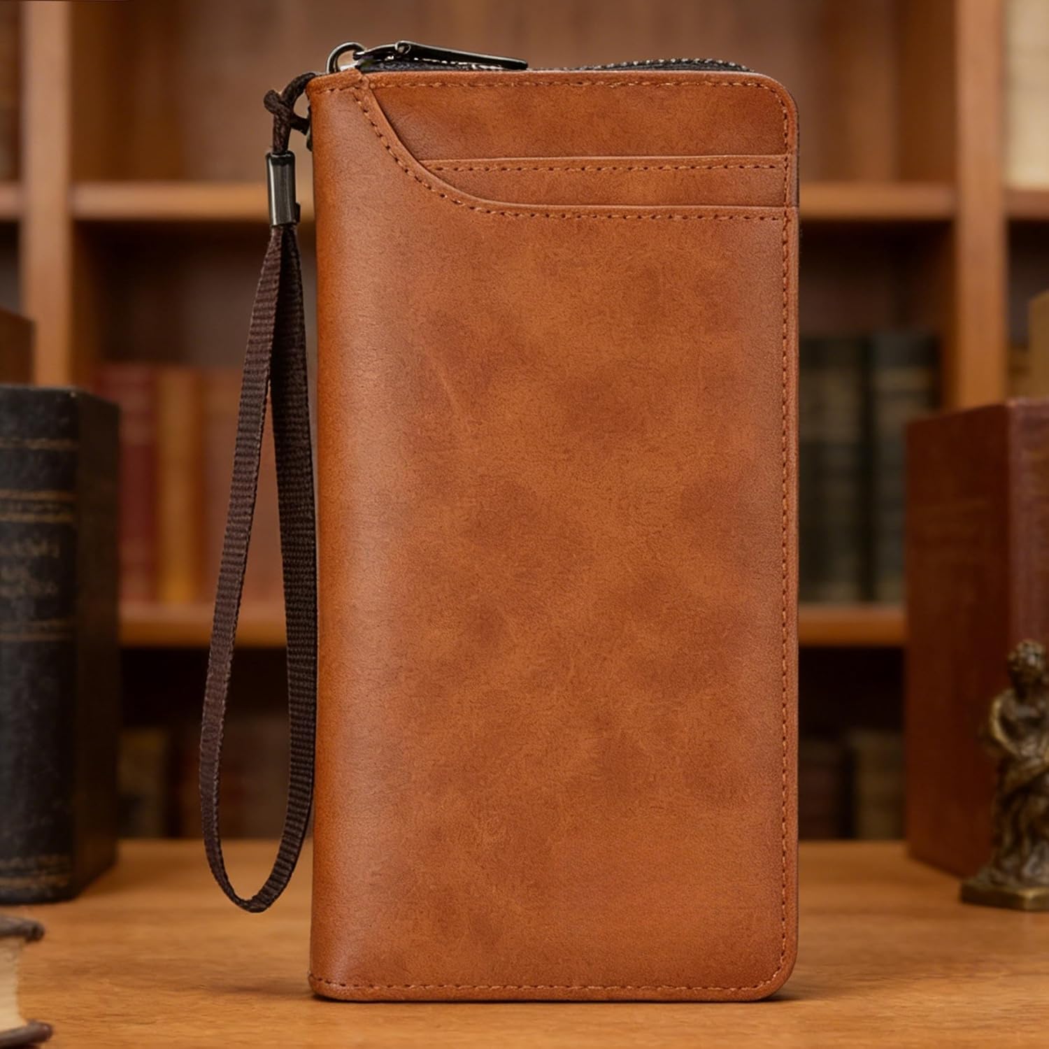 スエード調の質感が特徴のメンズ向け長財布。ライトブラウンカラーで落ち着いた印象があり、ビジネスシーンにもなじみやすいデザインです。カードや紙幣、小銭などをまとめて収納できる大容量設計で使い勝手も良好。バックル付きでしっかり閉じられるため中身が見やすく、日常使いにも適した実用的なアイテムです。