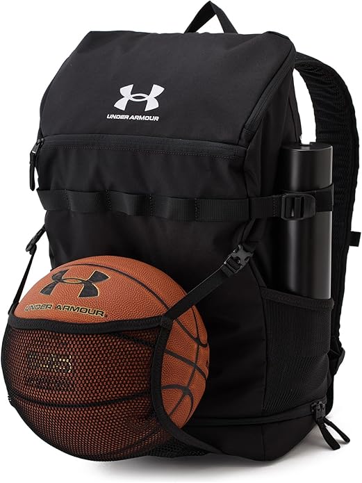 バスケットボール用に設計されたUnder Armourのバックパック。取り外し可能な外付けネットでボールを収納でき、下部にはシューズ専用スペースを搭載。ラップトップPC収納も備えており、部活やジム、通学まで幅広く対応します。両サイドにはペットボトルが入るポケット付きで使い勝手も良好。機能性と収納力を兼ね備えた実用的なスポーツバッグです。
