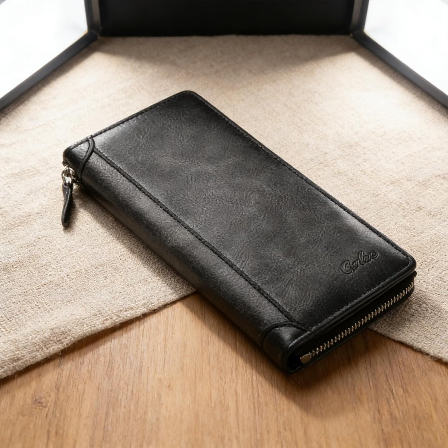 スエード調素材・無地ブラックのメンズ向け長財布。複数の収納スペースを備えたマルチコンパートメント設計で、カードや紙幣、小物を整理しやすいのが特長です。オープンデザインで中身が見やすく、日常使いでも扱いやすい仕様。落ち着いたブラックカラーでビジネスからカジュアルまで幅広く使いやすいアイテムです。