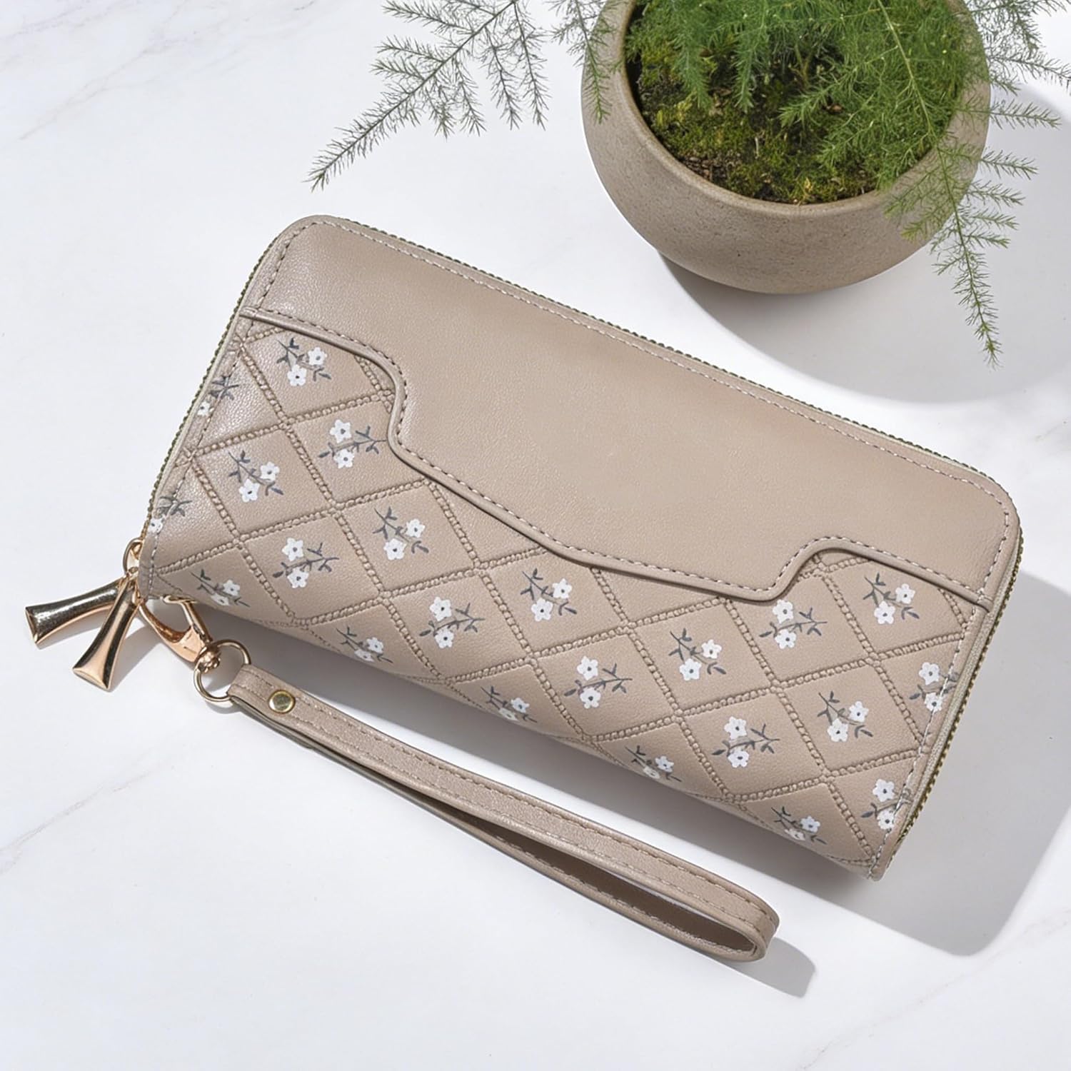 シックなグレーカラーのレディース向け長財布。ダブルジッパー仕様で収納スペースが分かれており、カードや紙幣、小物を整理しやすい設計です。RFIDブロック機能付きでスキミング対策にも配慮。クラッチバッグのように持ち運べるデザインで、日常使いから外出時まで幅広く活躍。大容量ながらすっきり使える実用的なウォレットです。