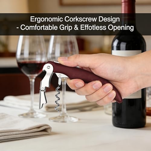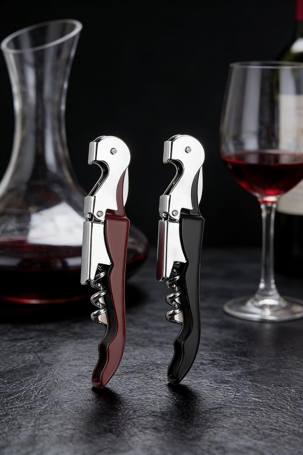 コルク抜き・ボトルオープナー・ホイルカッターを一体化したオールインワンタイプのワインキー。手動式でコンパクトな設計のため、自宅のキッチンはもちろん、アウトドアや旅行先でも使いやすいのが特徴です。ブラック&レッドのシンプルなデザインで、ホームバーやレストランでも扱いやすい仕様。2個パックなので予備や使い分けにも便利です。