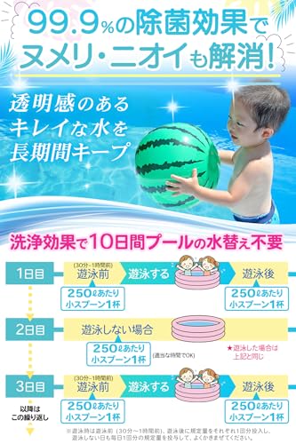 150g入りで約300杯分使える圧倒的コスパ。日本製の次亜塩素酸ナトリウム生成タイプで、250Lの水に小スプーン1杯でOK。除菌率99.9%で、最大10日間水替え不要。計量スプーン付きで扱いやすく、衛生的なプール環境を手軽に維持できます。夏の家庭用プールやビニールプールに最適です。