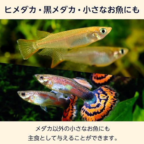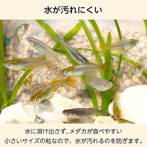 浮上性で小粒の顆粒タイプの餌。メダカの赤ちゃんでもつつきやすく、与えやすさと食べやすさを両立しています。水槽の水を汚しにくい配合で、観察や飼育環境の維持にも配慮。日常の主食として使いやすく、初心者にもおすすめの商品です。